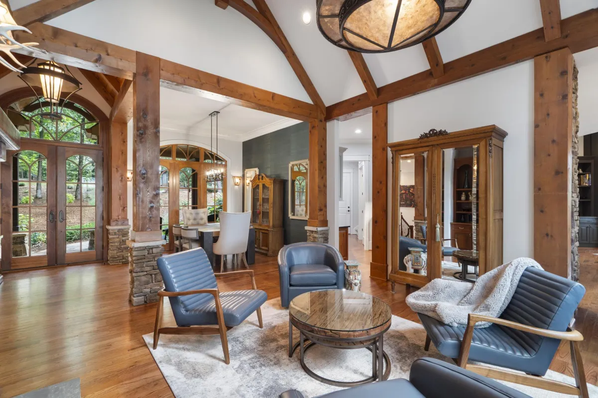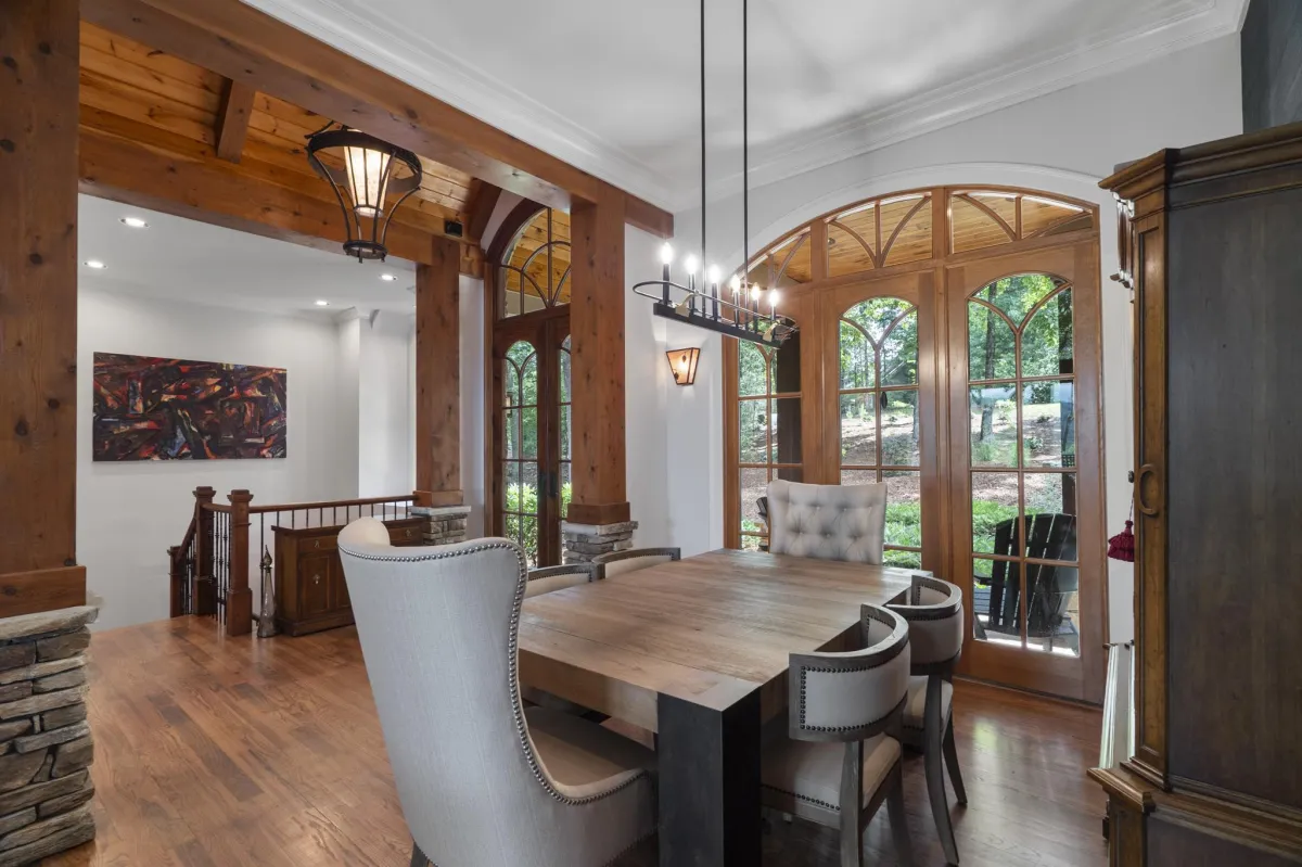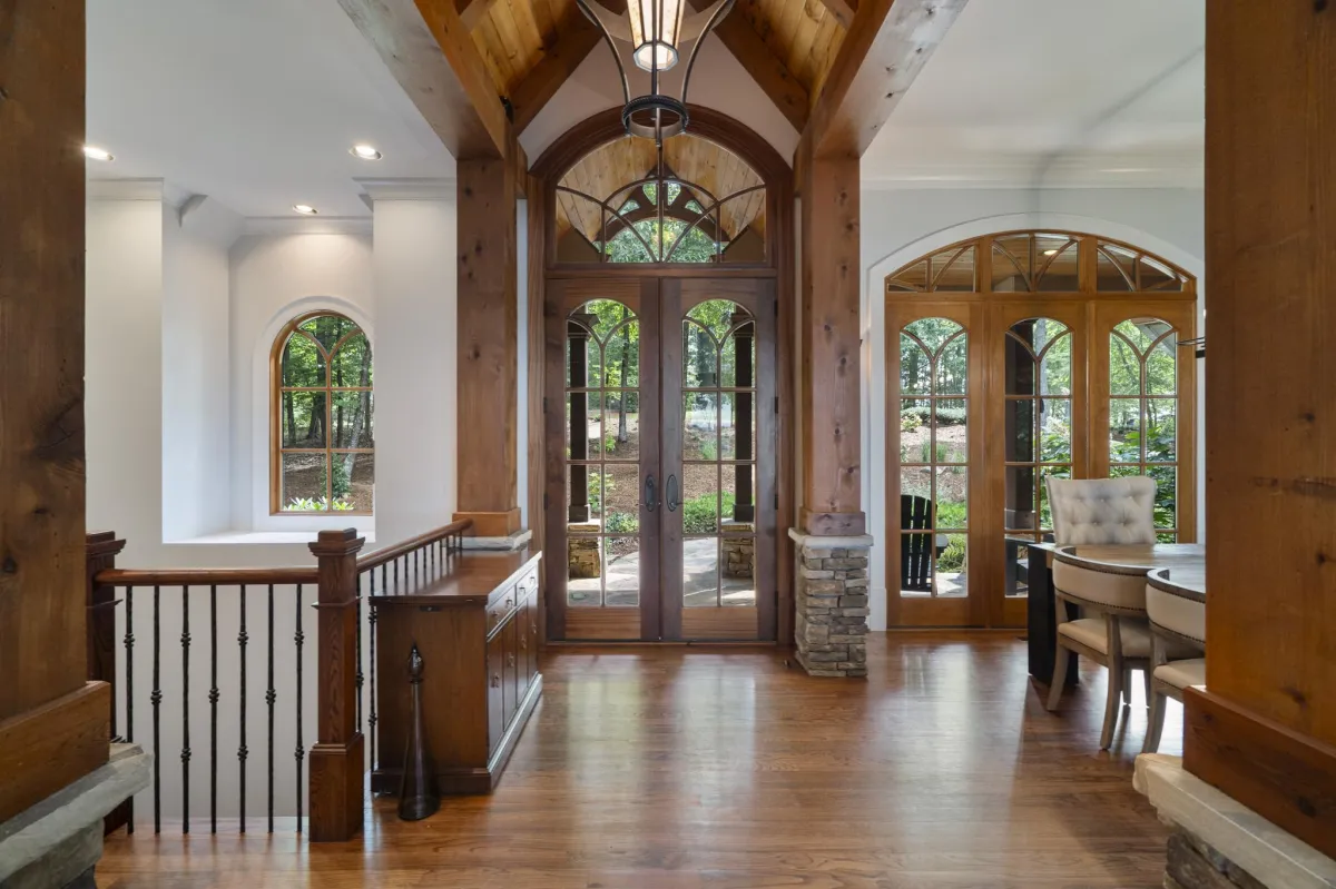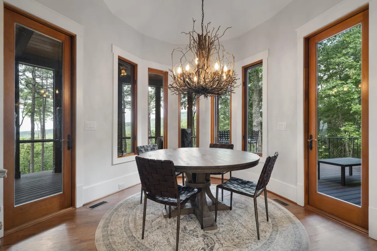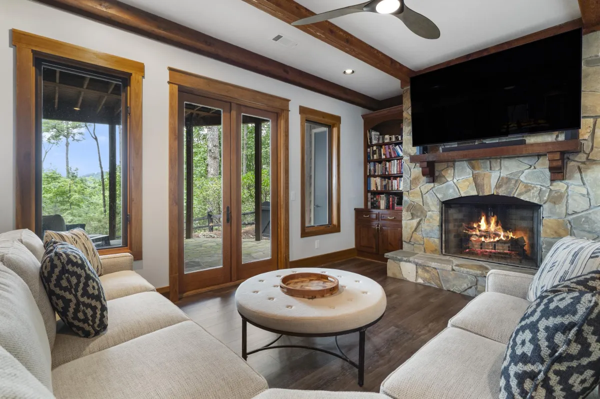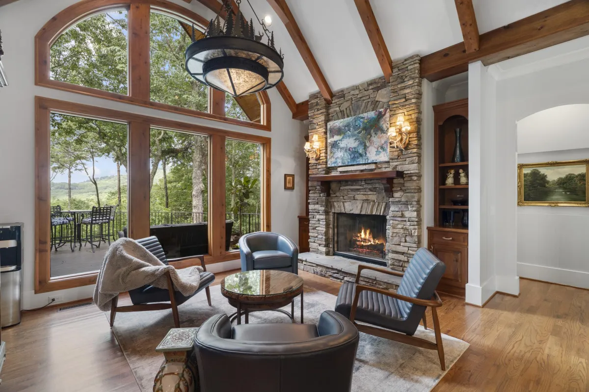 Upon entering through the grand entry, you’ll be greeted by rich wood floors, soaring vaulted ceilings, and hand-crafted chandeliers that showcase the home’s timeless character. The Great Room impresses with its arched windows, magnificent wood beams, and a stunning floor-to-ceiling wood-burning stone fireplace with gas starter, creating an inviting atmosphere for gatherings. The gourmet Kitchen is a chef’s dream, equipped with custom cabinetry, paneled appliances, a spacious island, a Wolf range, and a Sub-Zero refrigerator. Enjoy casual meals in the sunlit Breakfast Room, highlighted by a uniquely shaped tray ceiling. The adjacent Keeping Room offers another cozy retreat, featuring a fireplace, coffered ceiling, and picturesque views of Potts Mountain. An artist’s Studio off the Kitchen provides built-ins and inspiring mountain vistas, ideal for creative pursuits. The main-level outdoor living areas include a covered porch with a fireplace and a curved open deck, perfect for entertaining or simply soaking in the views and sunset hour. The luxurious Primary Suite is a true sanctuary, featuring a wood-accented tray ceiling, private deck access, and expansive windows. The spa-like bath includes an arched ceiling, an oversized shower, dual vanities, and his-and-hers walk-in closets with custom shelving.