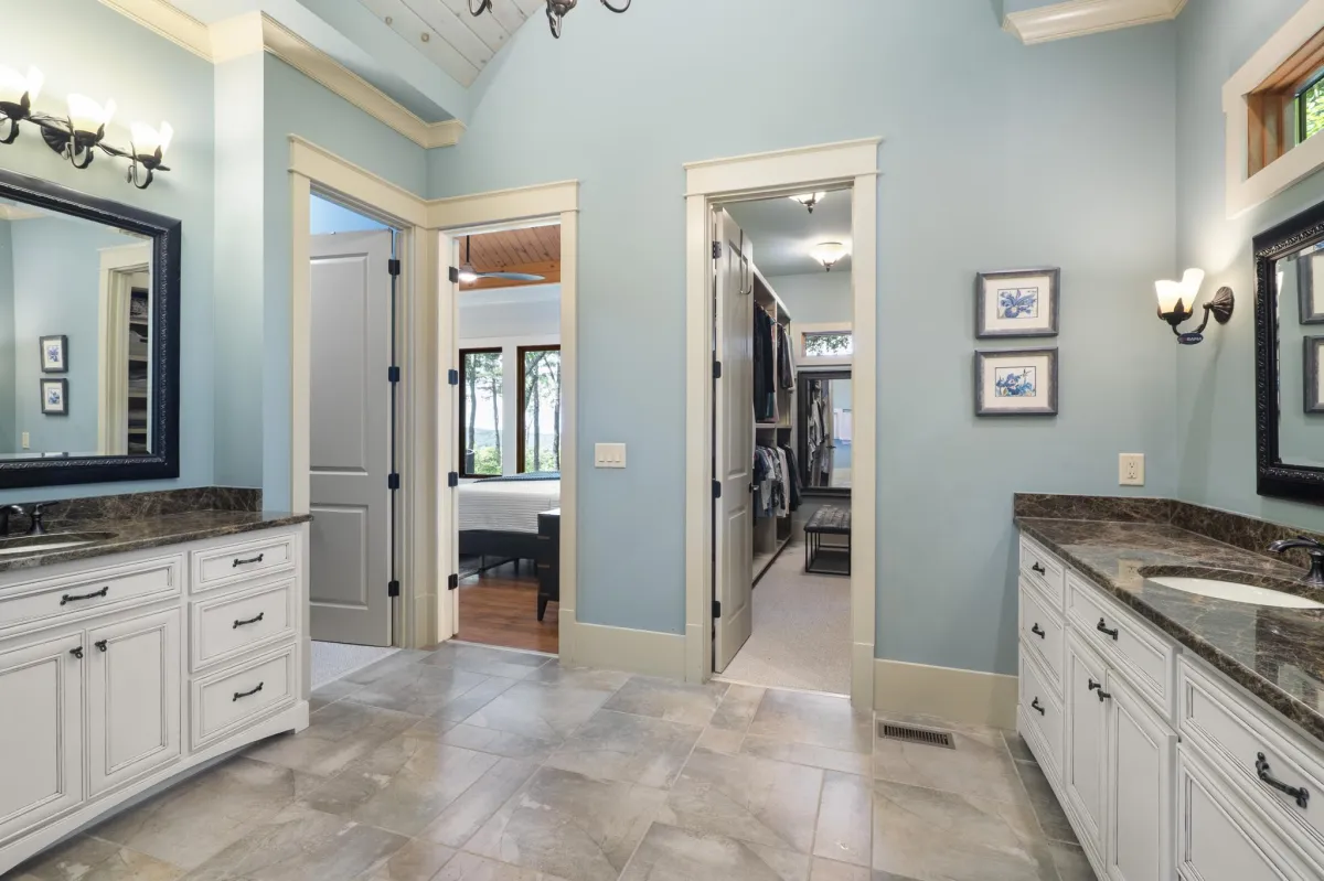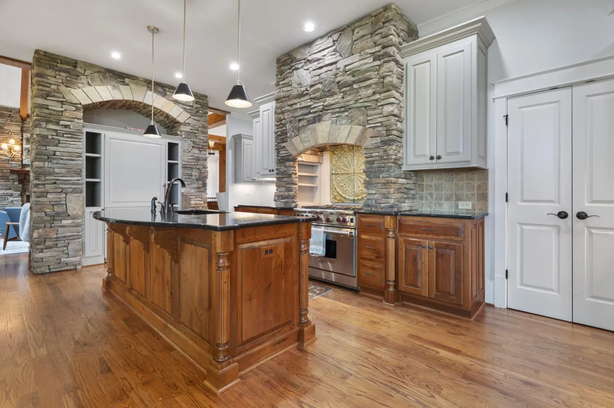 As you approach the home, you’ll be drawn in by its captivating mountain-style architecture and elegant exterior finishes. A serene stone walkway, bordered by lush perennial gardens, leads you to a welcoming water feature at the stone front porch. Enjoy the sunrise as you sip your coffee. This tranquil setting sets the tone for the peaceful living experience that awaits inside.